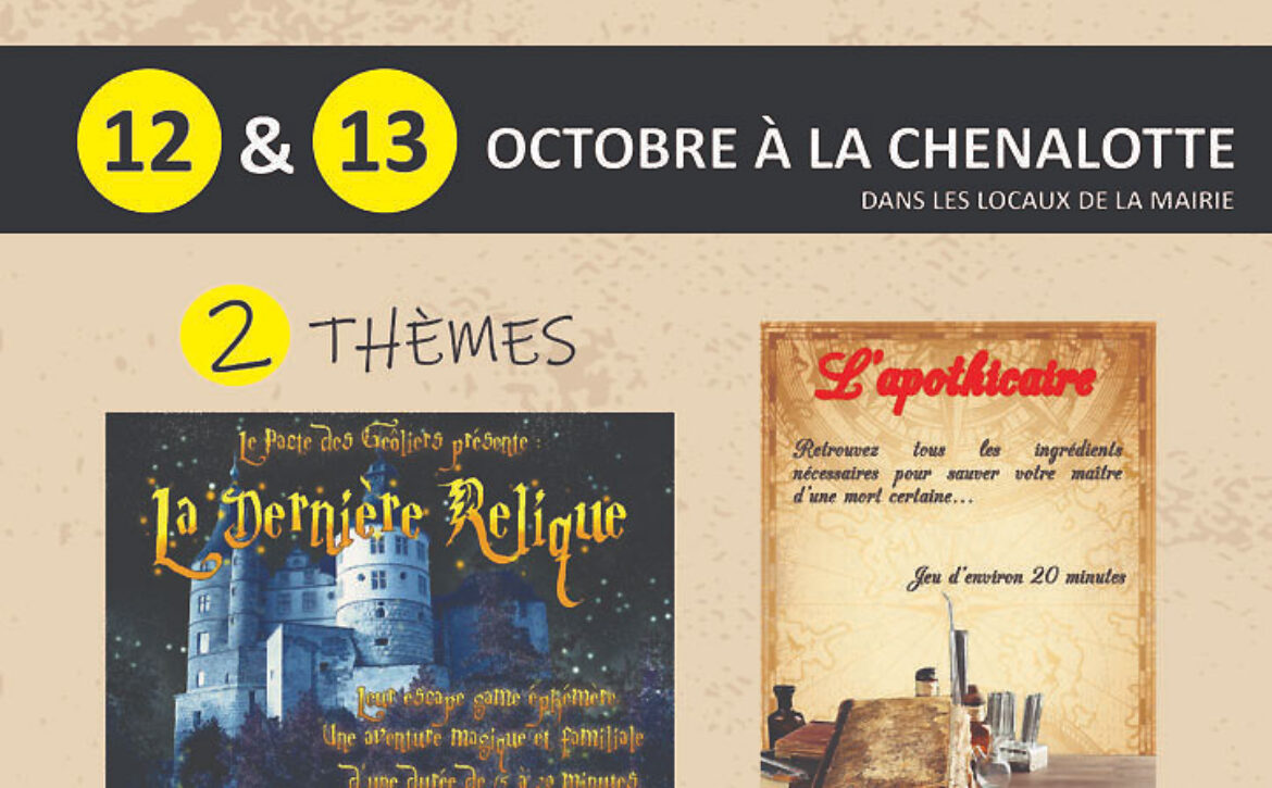 Escape Game, dans les locaux de la Mairie de la Chenalotte, 12 & 13 octobre 2024, 2 thèmes, gratuit.