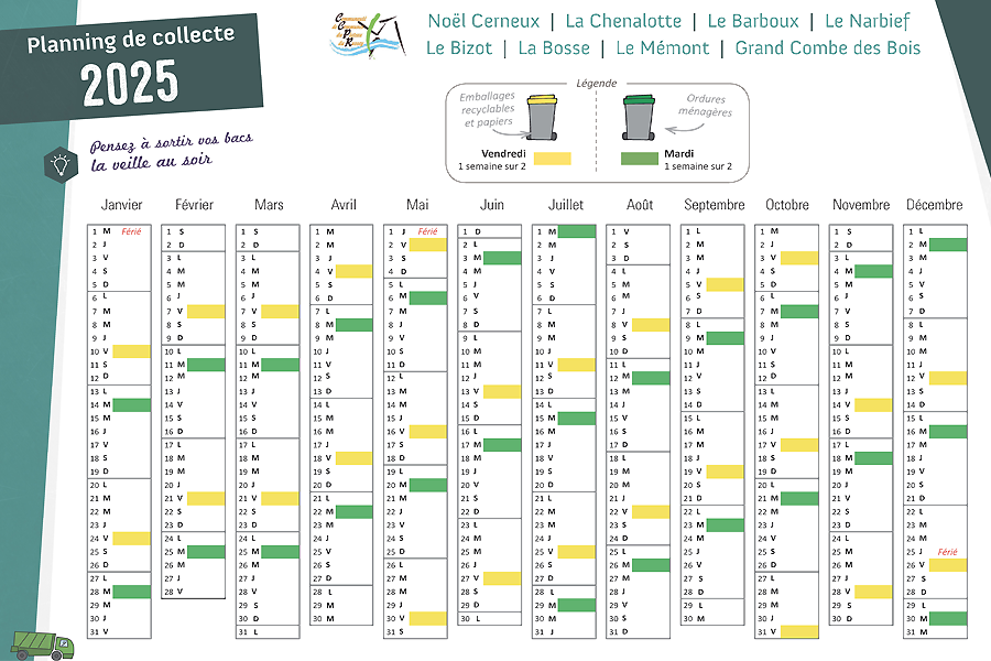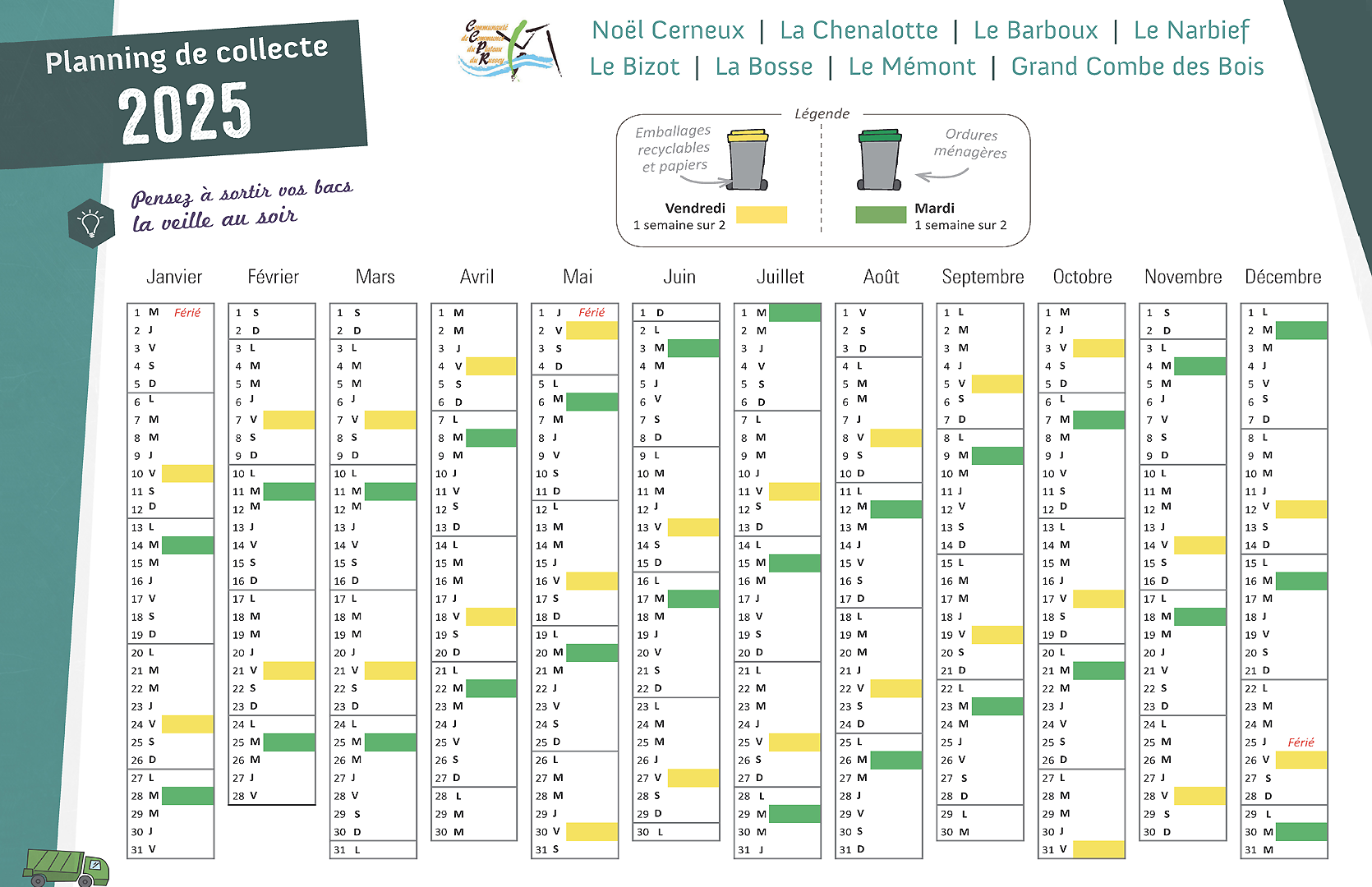 Les bacs verts (ordures ménagères) et Jaunes (tri) sont collectés tous les 15 jours.