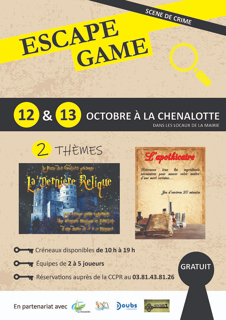 Escape Game, dans les locaux de la Mairie de la Chenalotte, 12 & 13 octobre 2024, 2 thèmes, gratuit.